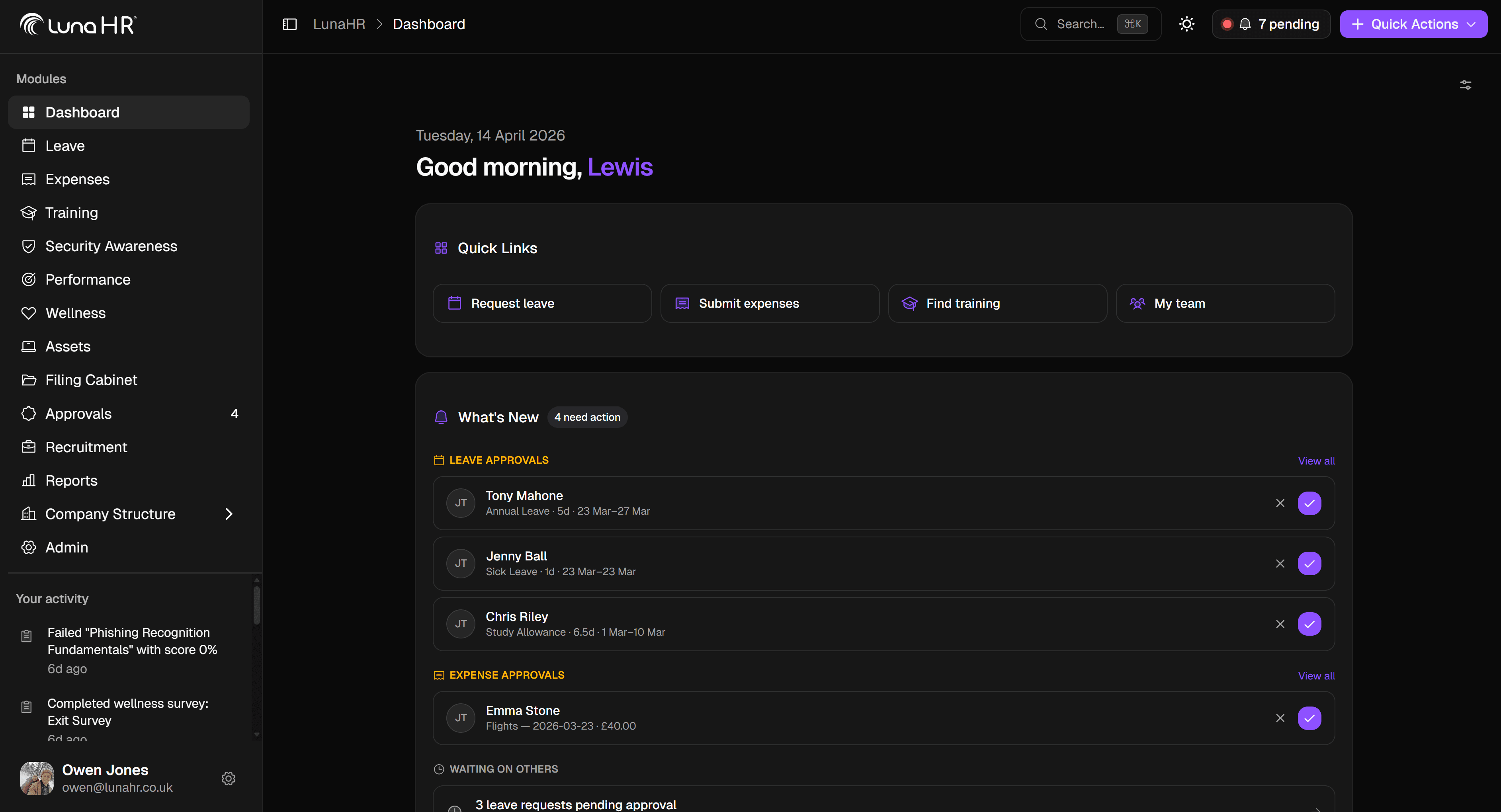 “We switched from three separate tools to Luna HR and had the whole team onboarded in a day. Approvals, expenses, leave — it just works. And we only pay for what we actually use.”
